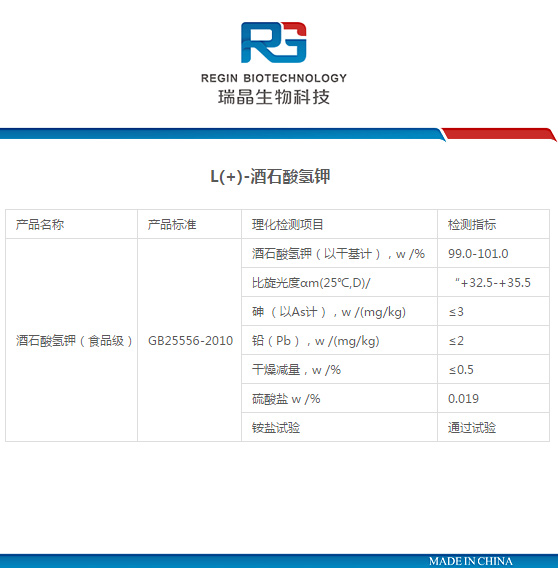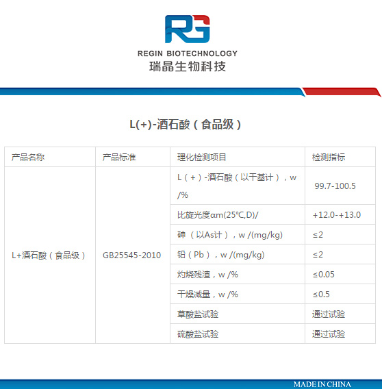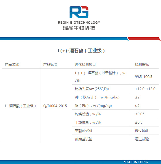 广泛用于食品、医药、化工、轻工等行业,主要用于制造酒石酸盐类,如酒石酸锑钾、酒石酸钾钠等。在食品行业用作啤酒发泡剂、食品酸味剂、矫味剂等。其酸味为柠檬酸的1.3倍,特别适用作葡萄汁的酸味剂。本品经FAO/WHO专家委员会鉴定为优良之食品添加剂。它在鞣革、照相、玻璃、搪瓷、电讯器材等工业也有非常重要的作用。